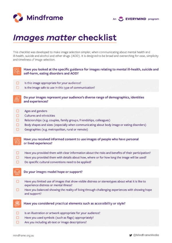 Images matter: Mindframe guidelines for image use is a practical, research-informed, and user-friendly resource that is designed for media and other communicators. It seeks to inform, support and empower people to select and use images in ways that minimise stigma and harm and maximise diversity of representation.